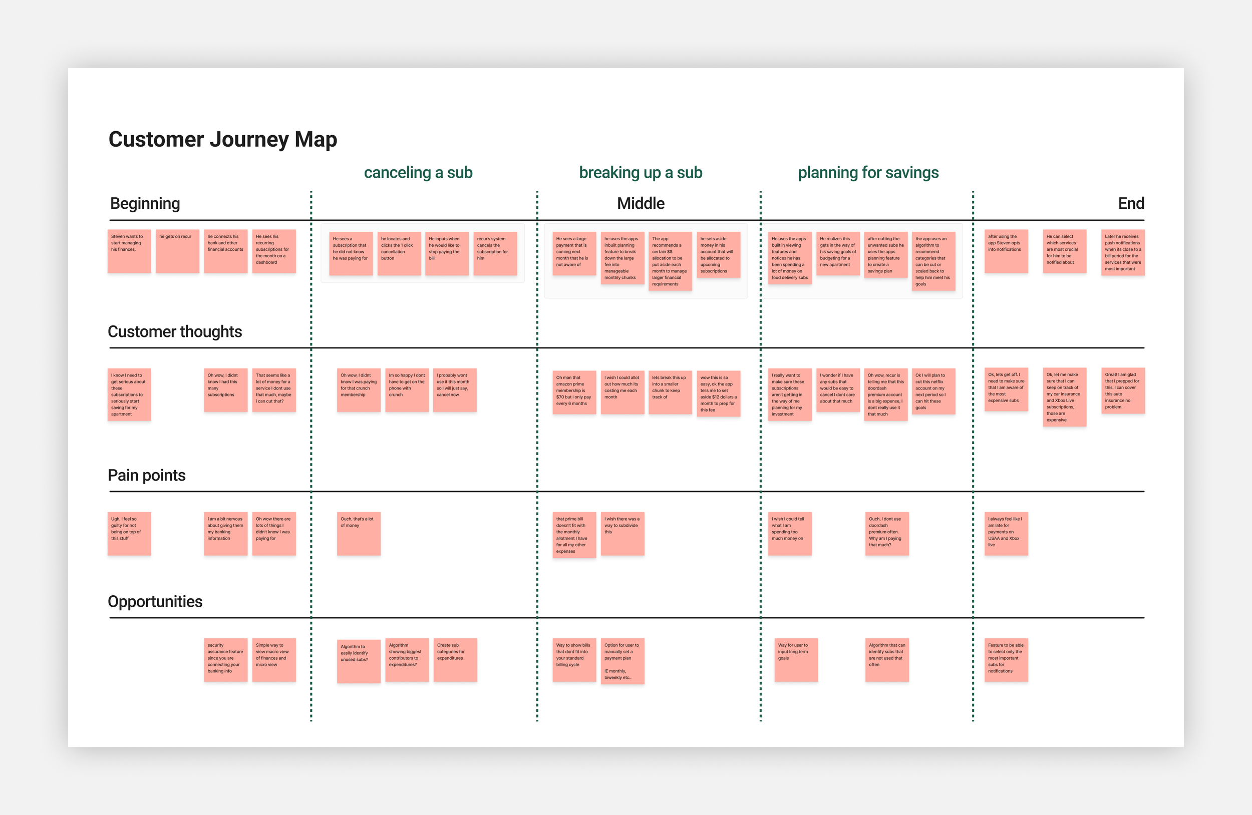 Following the discovery phase of the project, I began trying to synthesize my learnings. In this phase I employed Affinity Mapping, Journey Mapping and creating a list of prioritized features that were distilled from my Jobs to be Done.